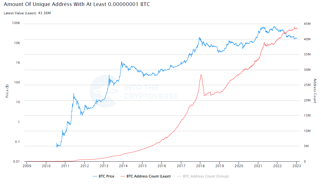 The blue line shows the price of Bitcoin, and the red lines shows the number of unique address (or crypto accounts if you prefer) holding some Bitcoins. The trend is clear and does not seem to slow down even when the price pulls back. The Bitcoin Public ledger provides highly reliable data that cannot be manipulated, ensuring the authenticity and accuracy of the data.