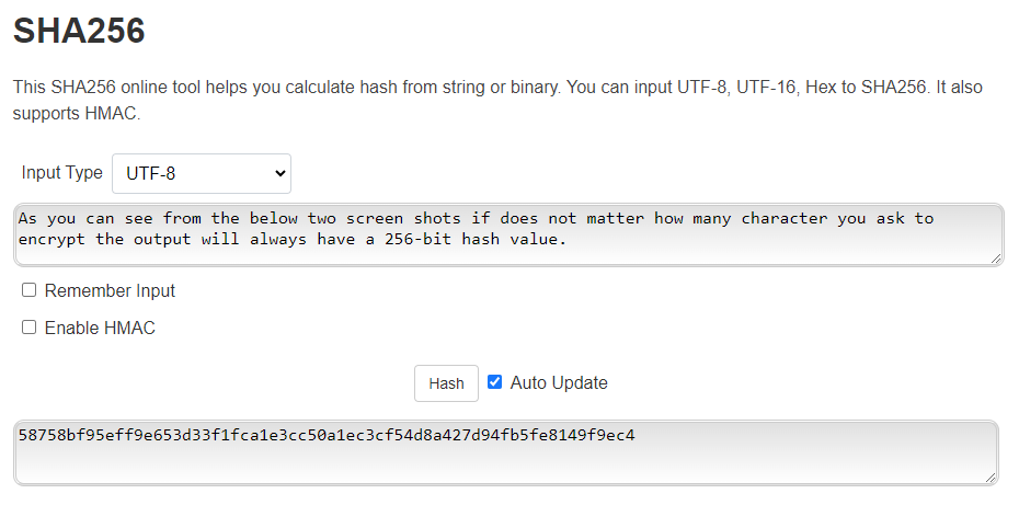 You can find here, an online tool that allows you to play with the cryptographic hash function. As you can see from the below two examples it does not matter how many character you ask to encrypt the output will always have a 256-bit hash value.